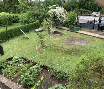Jardin à l'avant et à l'arrière avec rosace, pommier et potageren (400m²)