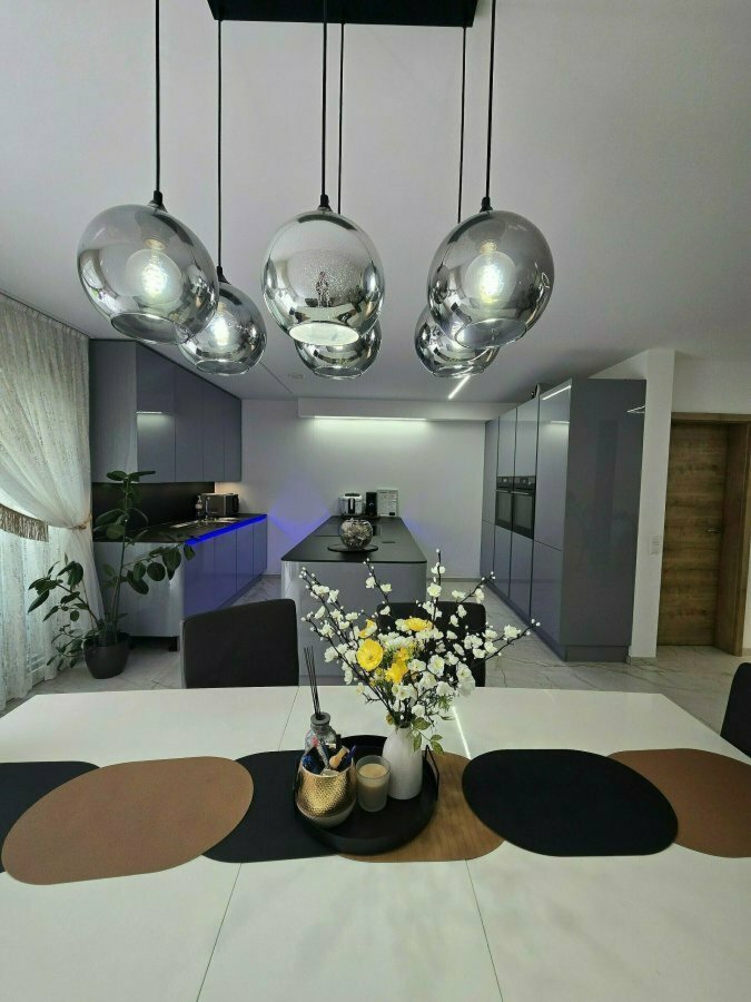 Le hall spacieux, équipé de rangements vous guide vers un espace de vie convivial, habillé de mobilier de qualité et d'une cuisine haut de gamme moderne fonctionnelle et parfaitement intégrée aves espace débarras.