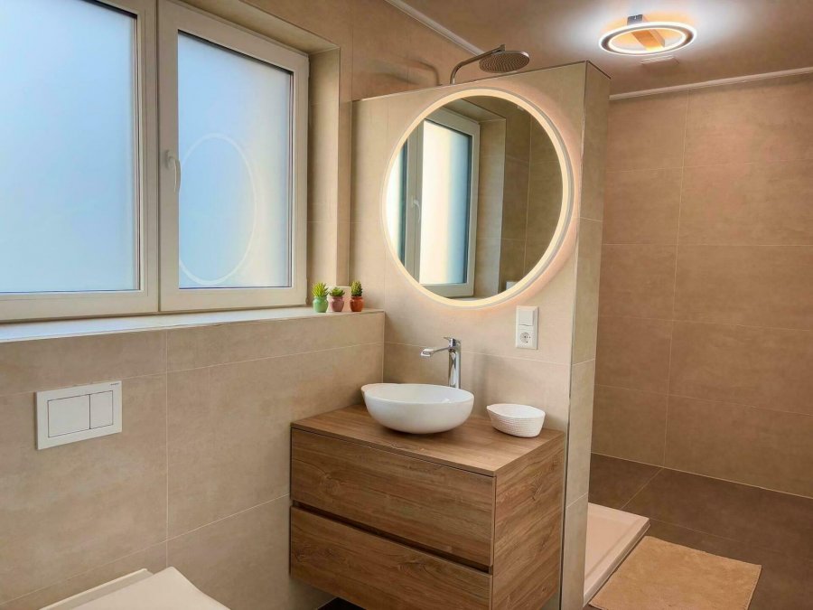 - hall d'entrée, salle de bain avec fenêtre, cuisine ouverte bien équipée avec séjour et salle à manger avec accès vers terrasse, débarras et 2 chambres à coucher.